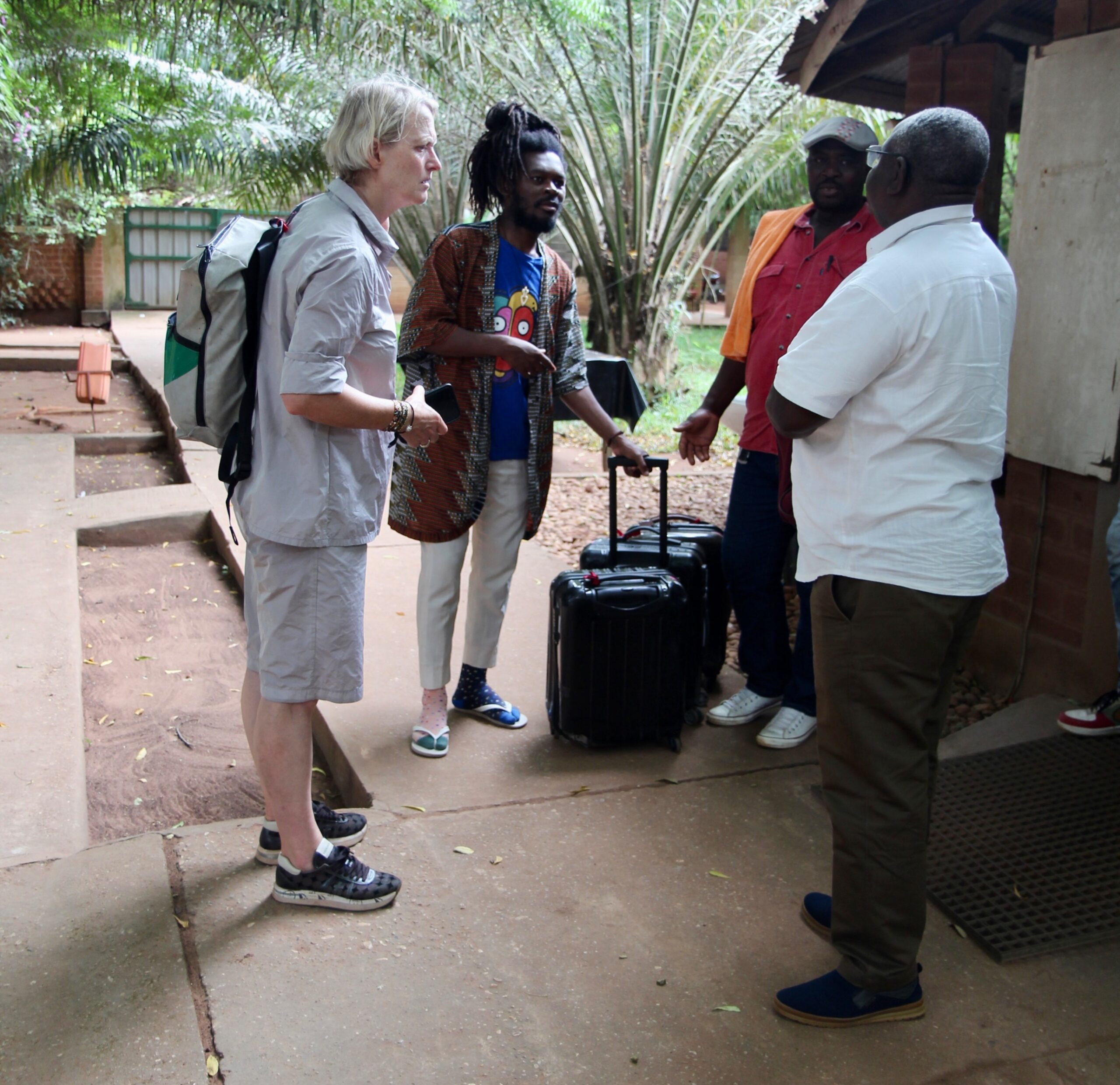 In drei Koffern, ganz klein und unscheinbar, hat es je 20 kg Pulver drin! Das wird dann, einmal auf rotem togolesischem Sandboden gelandet, zu Konstruktionszwecken für das neue Spital verwendet, denn die neue Augenklinik soll mit nachhaltigem Erdbeton und heimischem Boden gebaut werden. Aber dazu später. Hier sind wir noch weit entfernt von der Architekten-Sitzung, bei der auch Uta und Valeria dabei sein werden.