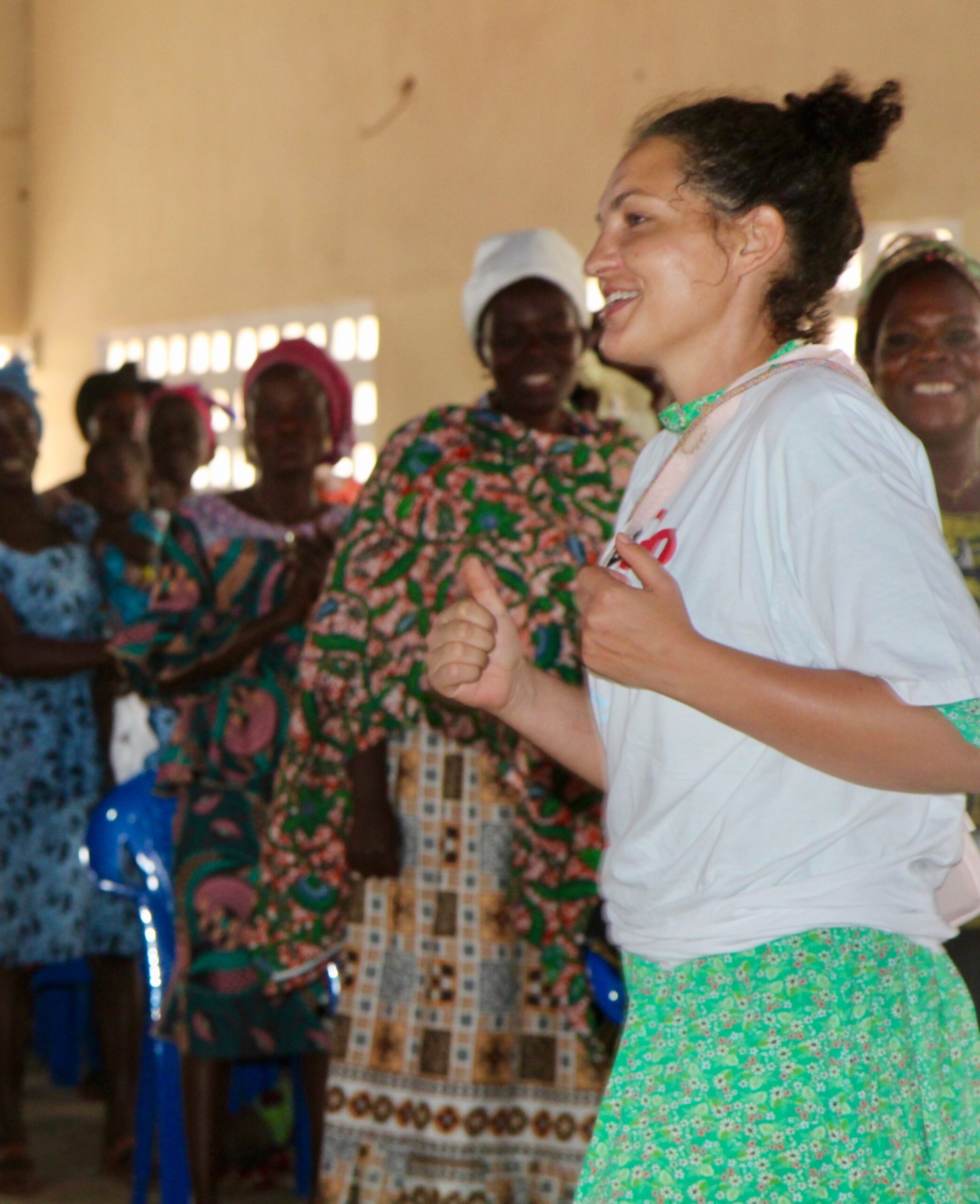 Uta und Valeria machen sich gemeinsam mit Père Théo auf den Weg nach Sichem, einer gemeinnützigen Kooperative mit einer Bibliothek, einem kleinen Laden, Hühner- und Schweinezucht, und einem Hörsaal für Studierende aus dem Bereich Landwirtschaft. Auf uns warten: Dr. Gnanli Landrou höchstpersönlich, der Erfinder des zementfreien Erdbetons und Inhaber der Firma Oxara. Dieser Erdbeton wird das Lebenselixier für die neue Augenklinik werden, die Uta schon seit stolzen vier Jahren plant. Gemeinsam mit der leider verstobenen Architektin Sibylle Bucher. Landrou ist vom weiten togolesischen Norden bis zu uns in den Süden gefahren. Komi Adegon, der coole Architekt, heute in Grau erschienen, und die taffen Bauleute mit ihrem Chef Raphaël Adzamah, sind auch da. Es gibt eine Tour durch das weitläufige Gelände. Uta und Valeria sehen zum ersten Mal einen Spielplatz und Spielzeug in der Bibliothek. Denn die Kinder in Togo spielen nicht, wir hören sie aber singen oder Klatschspiele machen, die sie in der Schule gelernt haben, um Französisch zu lernen.