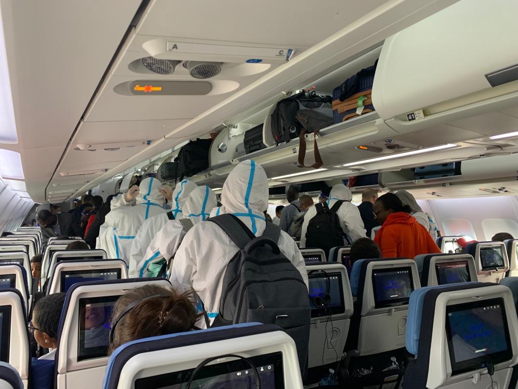 Dann: Flughafenmetro, problemloses Check-in der Koffer, und ab auf den Flieger. Die Chinesen sind auch unter uns. Eingepackt in weissem Ganzkörperanzug, einer hat sogar eine Schutzbrille montiert. Zwischenlandung in Niamey. Fast der ganze Flieger geht raus, auch die Chinesen.