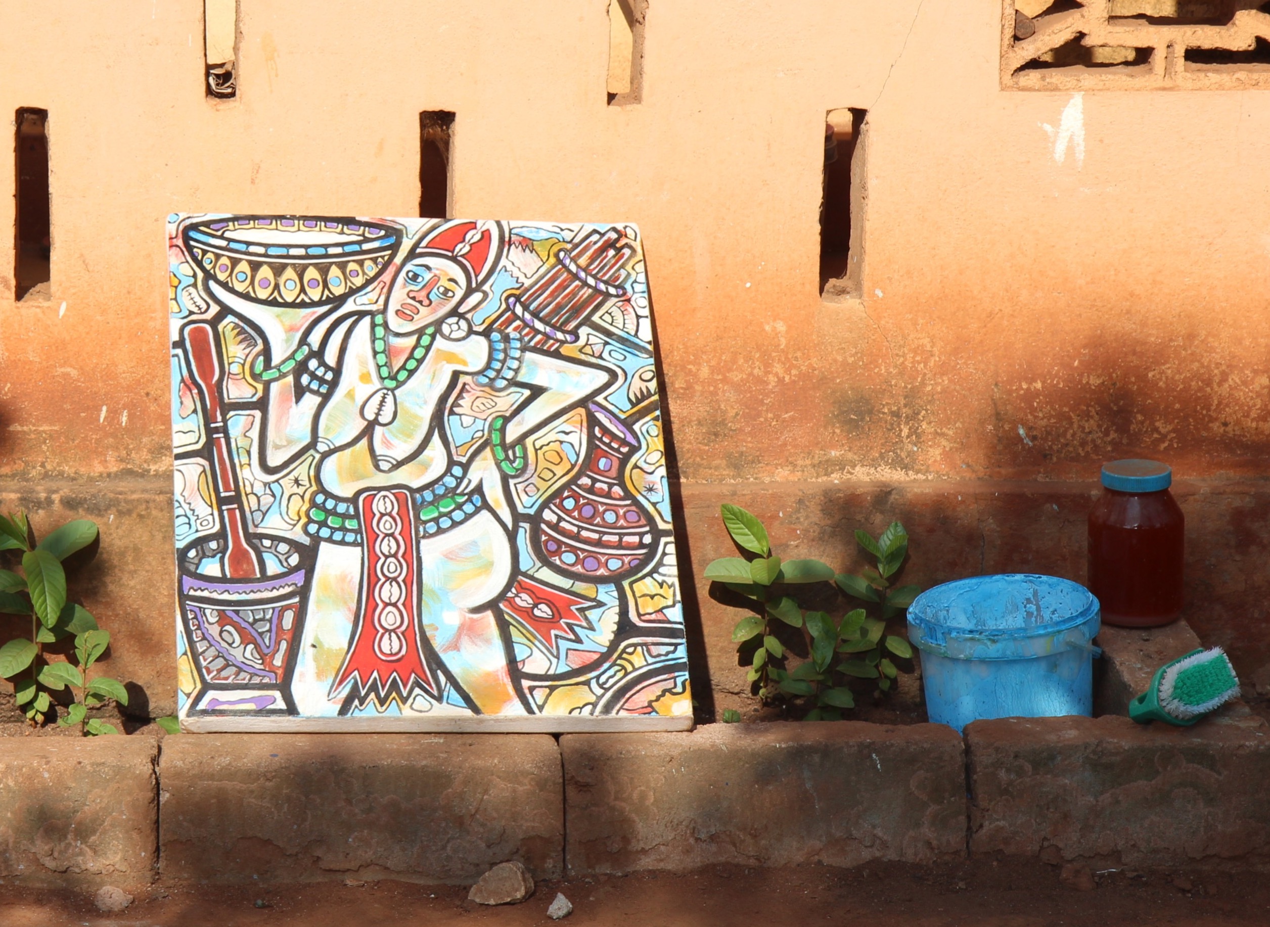 Am Nachmittag gehen wir zu Fuss zu Père Théo, dessen Haus etwa 45 min. von uns entfernt ist. Wir sehen: Den schwarz verkohlten Fisch in den Marktständen. Benzin, das in Flaschen abgefüllt verkauft wird: Tankstelle. Wir machen einen Abstecher bei Hubert, einem vortrefflichen, aber leider armen Maler mit sechs Kindern. Er zeigt uns seine Kunstwerke. Eines erklärt er uns ausführlich: Die afrikanische Frau und ihre Lasten. Sie muss das Essen auf den Tisch bringen und Kinder gebären. Denn hier sind es die Frauen, welche die ganze harte Arbeit erledigen. Und weiter geht es zu Père Théo. Sein Grundstück ist riesig, grün, mit Bäumen, die Orangen sind ganz klein und grün. Er hat renoviert. Den Boden, die Küche, die Gästezimmer. Hier ist der togolesische Zweit-Sitz der Stiftung, Père Théo unser Stiftungsrat in Togo. Es wird getrunken, Bier, und vortreffliche Nüsschen werden serviert. Wir bekommen Besuch: Von Chef-Ärztin Akakpo und der Organistin Ruth Kuster. Fotos werden gemacht. Heimreise. Abendessen, es gibt Spaghetti und Pommes. Und dann: Licht aus, und ab unters Moskitonet